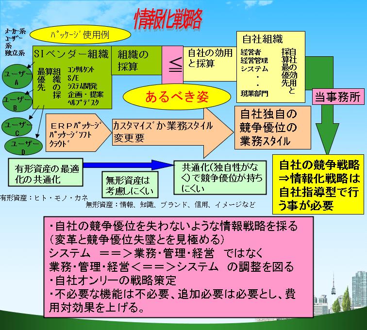 ERPやパッケージソフト否定する訳ではなく、元々の事業戦略の為の情報化戦略である事が考え方の機軸になるので、