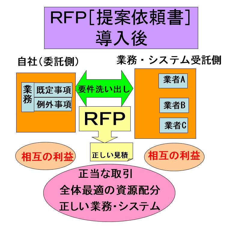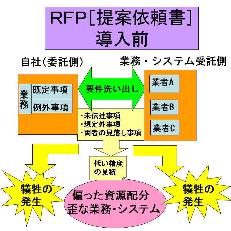 2.システム構築過程に於ける、テスト段階、試運用段階で新たに判明したシステム機能の違い又は不足により、余計な費用が発生しがちであります。この余計な費用をなくす為に、双方の隠れた認識の違いや想定外の事象を含んだRFPを作成する事により、総費用を抑える事ができます。 |